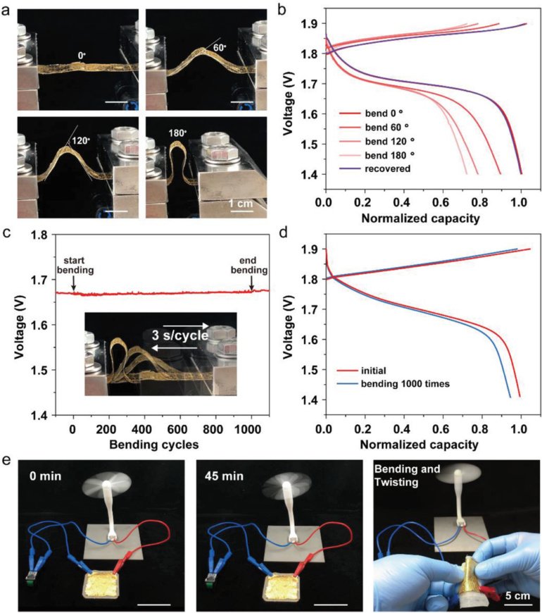 В процессе испытаний данная батарея 4×4 см с толщиной 0,4 мм на протяжении 45 минут питала маленький вентилятор. Устройство не переставало функционировать даже при скручиваниях и других механических деформациях.