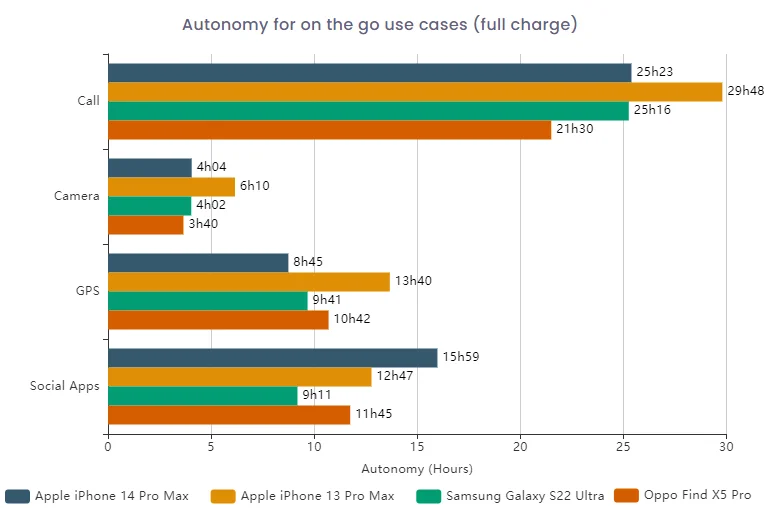 Автономность устройства тестировали в классических сценариях использования: навигационные карты, социальные сети, звонки, съемка фото и видео. По сравнению со смартфонами своей ценовой категории iPhone 14 Pro Max показал себя хуже всех, кроме соцсетей. Хуже всего у девайса дела обстояли с навигацией – в этом сценарии использования он расположился на последней строчки.
