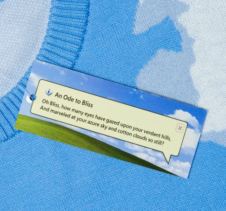 На этот раз дизайн свитера вдохновлен обоями для рабочего стола «Блаженство» из операционной системы Windows XP. На предмете одежды также имеются курсор мыши и бирка с текстом оды к ОС.
