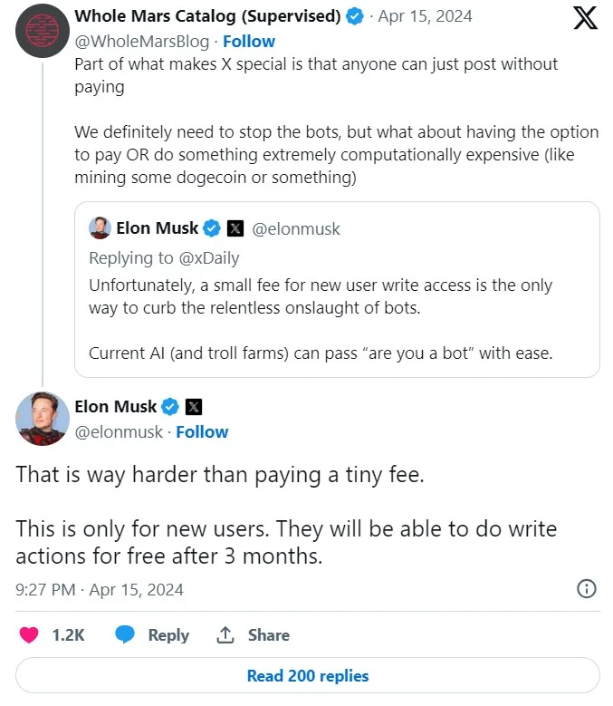 По словам миллиардера, данное решение является единственным методом сдерживания ботов, так как привычный инструментарий вроде CAPTCHA легко обходится нейросетями. При этом Маск в ответе на вопрос одного из пользователей заявил, что плата будет взиматься не все время.