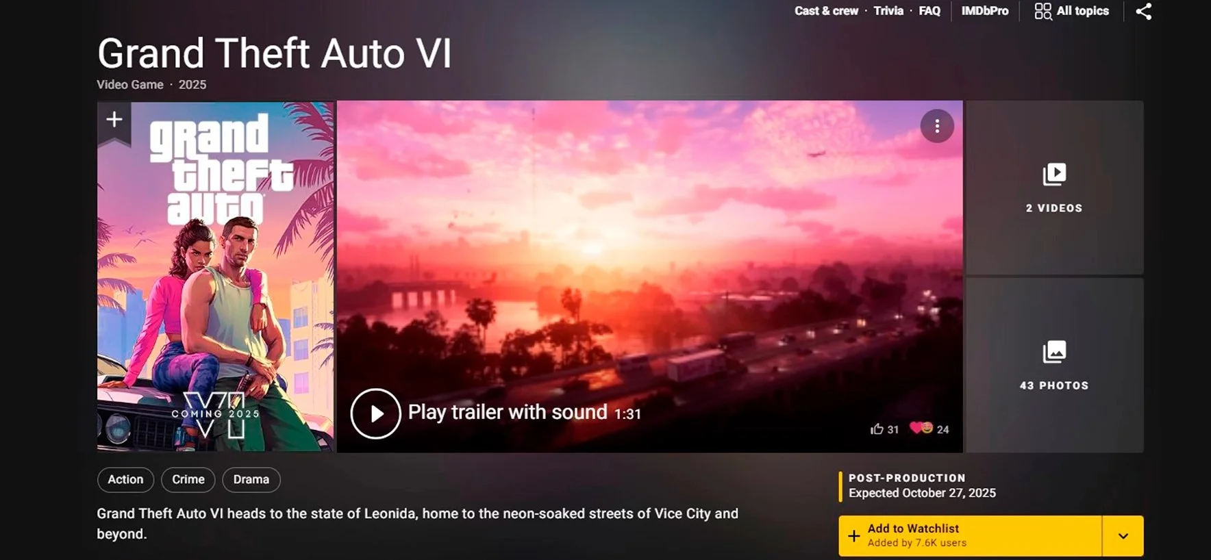 Дата релиза GTA 6 появилась на сайте IMDb. Вскоре она пропала