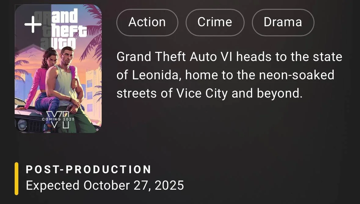 На портале Internet Movie Database (сокращенно – IMDb) появилась страница GTA 6 – без преувеличения самой ожидаемой игры на данный момент. В сети появилось несколько скриншотов, на которых указана дата релиза 27 октября 2025 года. Сейчас все данные о выходе стерли.