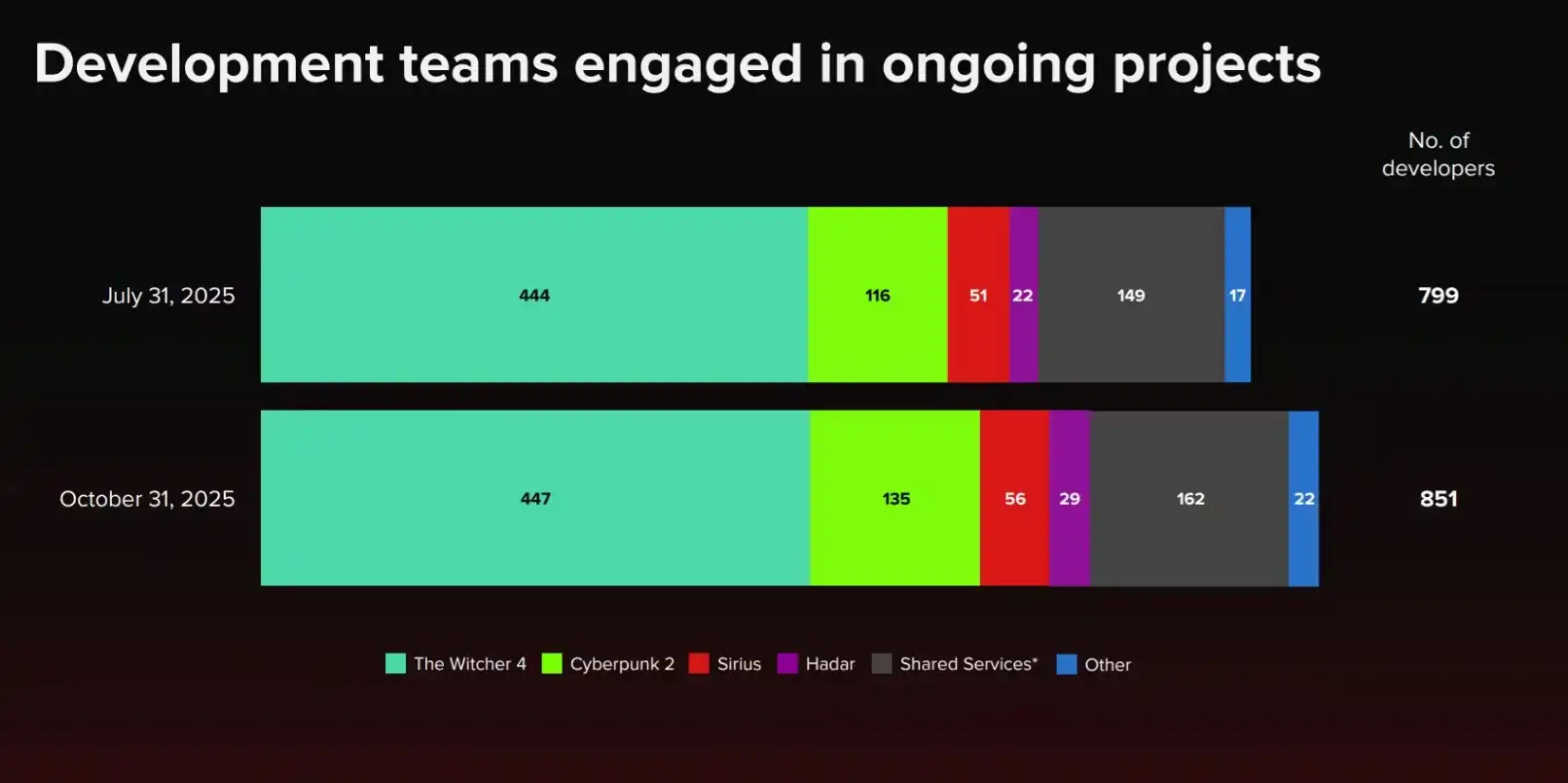 Особое внимание в отчёте уделили распределению кадров внутри студии. Наиболее крупная команда работает над новой частью «Ведьмака»: к концу октября над The Witcher 4 трудились 447 специалистов. Разработка следующей Cyberpunk ведётся меньшим, но быстро растущим коллективом — на тот же момент в проекте участвовали 135 сотрудников.