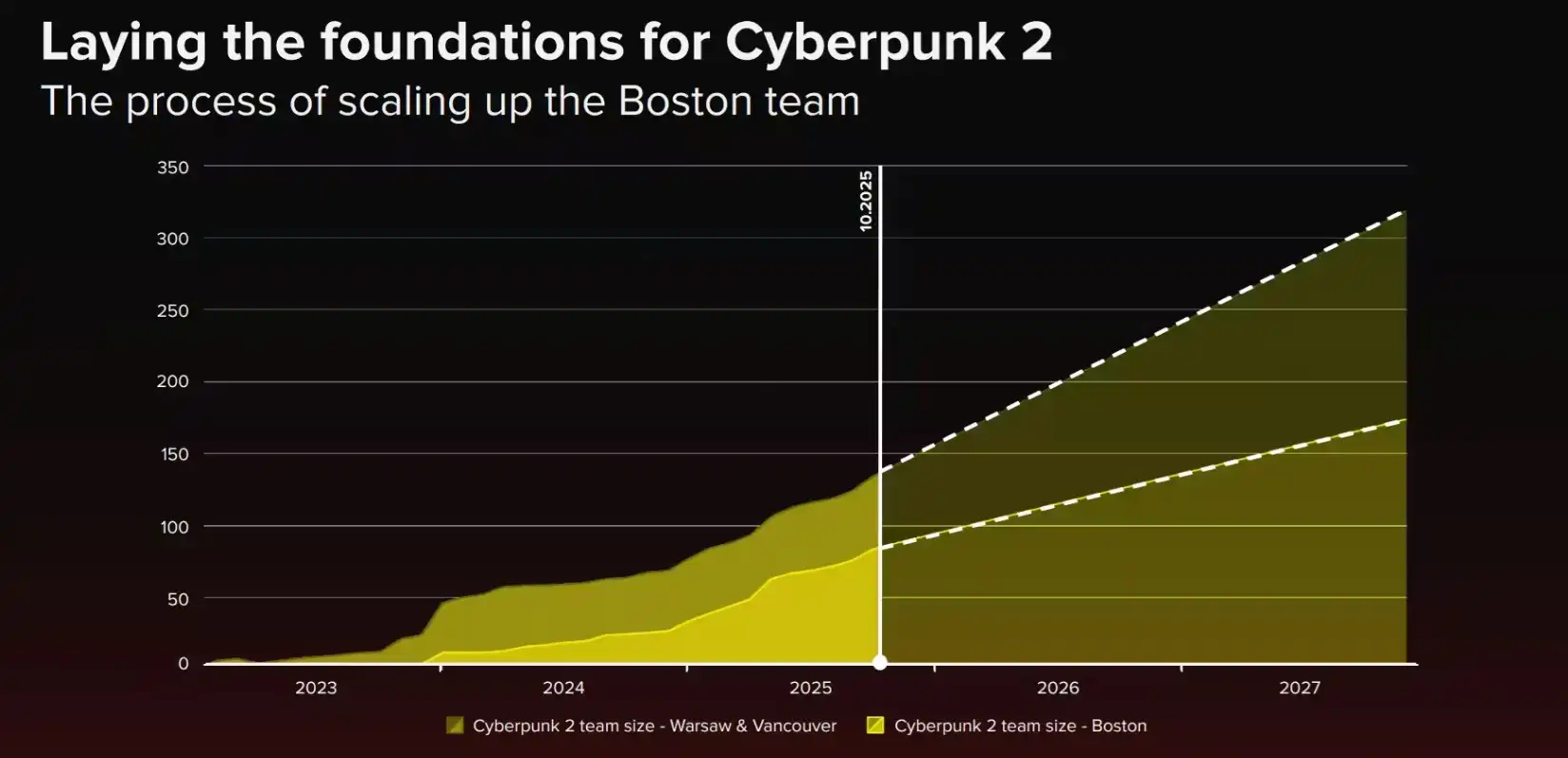 CDPR опубликовала динамику расширения команды Cyberpunk 2. Это подразделение развивается быстрее всех внутри компании. Уже к середине следующего года количество разработчиков должно вырасти до примерно 200 человек, а к 2027 году — превысить отметку в 300, что отражает масштаб и амбиции будущего проекта.