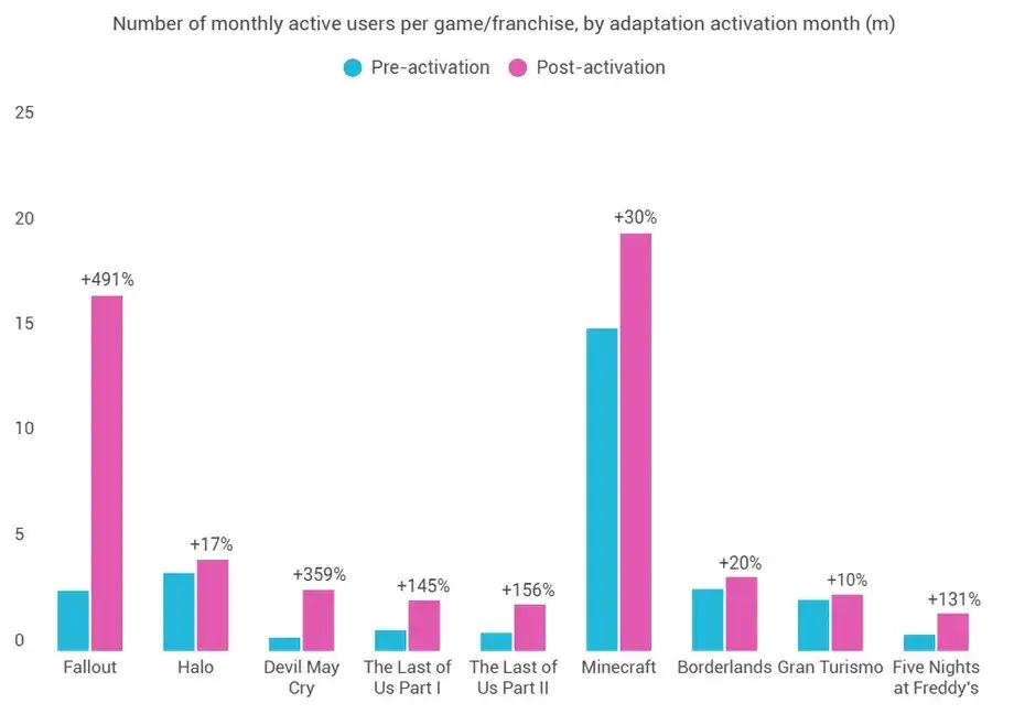 Ampere Analysis published a study showing that film adaptations significantly boost interest in video games. On average, the number of active players in the corresponding franchises increases by 203% after the release of TV series, while films produce a more modest result of around 48%.
