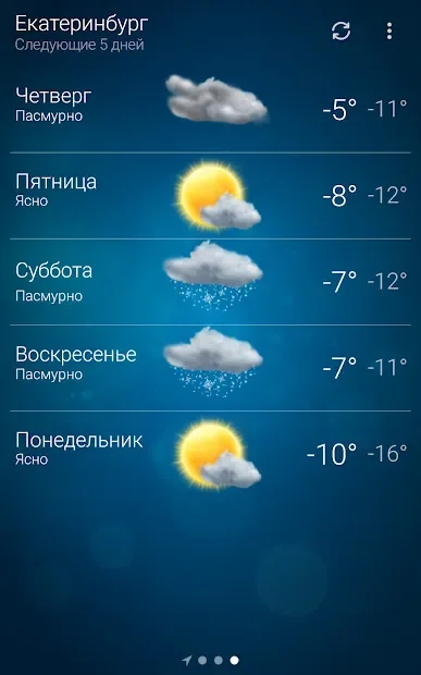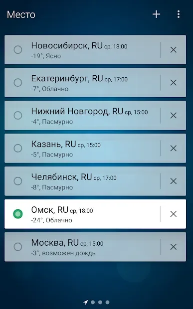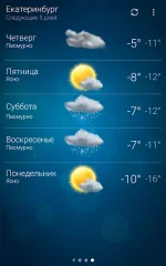 The program is easy to understand. Ease of use due to the fact that when running automatically determines your location and displays a summary for a specific region. Of course, if you need a weather forecast in other cities, you can always use the search. This provides a huge base of different localities around the world.